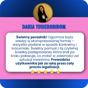 wreszcie zobaczysz, że legalizację da się przeprowadzić łatwo, logicznie i skutecznie. Poradnik daje Ci gotowy plan, przykłady, schematy i jasną interpretację przepisów, dzięki którym zaczniesz działać z pewnością siebie, zamiast błądzić w urzędowym labiryncie.