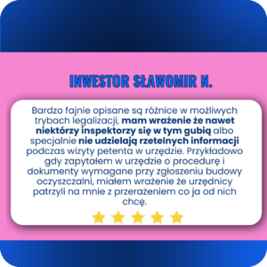 w końcu będziesz dokładnie wiedzieć, co zrobić, aby uniknąć nakazu rozbiórki. Zamiast żyć w strachu, że „kiedyś ktoś zapuka”, dostajesz jasną ścieżkę działania, która daje Ci pewność, że Twoja budowa jest do uratowania i że możesz legalizację przeprowadzić mądrze, bez stresu i bez zgadywania.