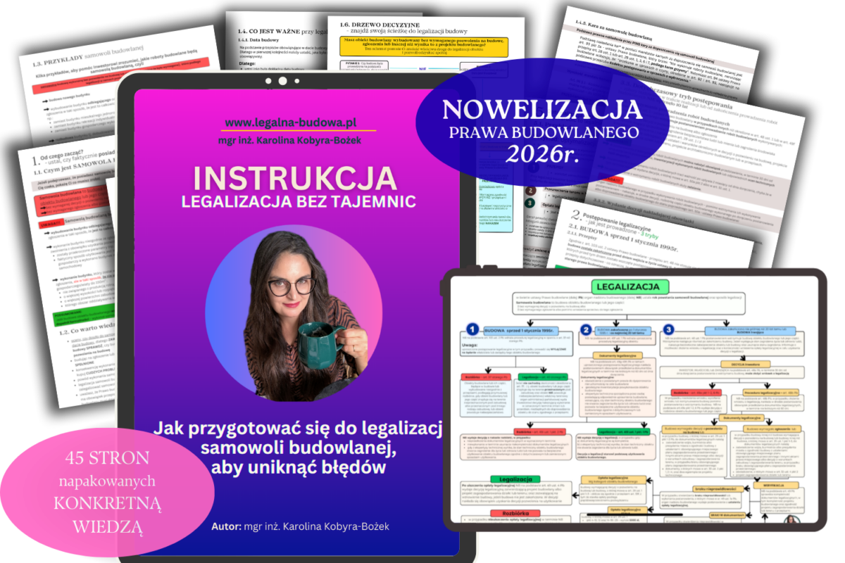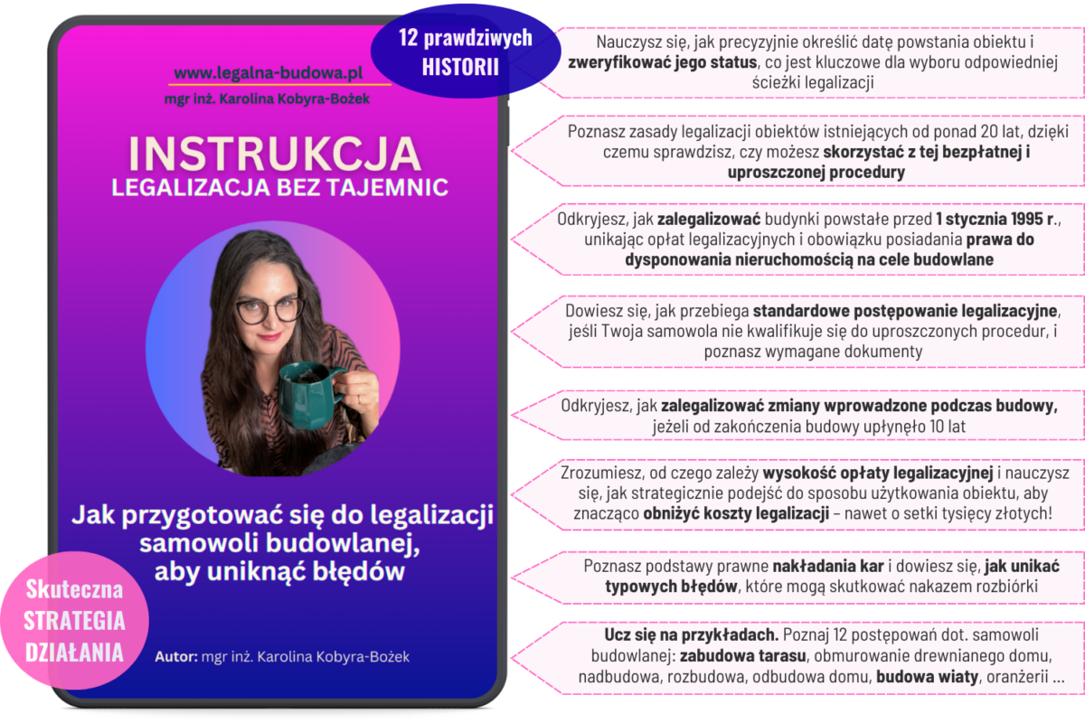 w końcu będziesz dokładnie wiedzieć, co zrobić, aby uniknąć nakazu rozbiórki. Zamiast żyć w strachu, że „kiedyś ktoś zapuka”, dostajesz jasną ścieżkę działania, która daje Ci pewność, że Twoja budowa jest do uratowania i że możesz legalizację przeprowadzić mądrze, bez stresu i bez zgadywania.